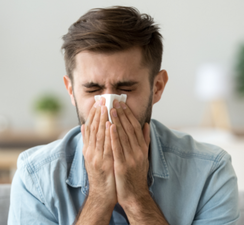 Hay fever, also known as seasonal allergic rhinitis, is an inflammatory condition affecting the inner nasal passages that is triggered allergens such as pollen, dust, mould or fungal spores). It is an extremely prevalent condition, affecting an estimated 1 in 5 individuals in the United Kingdom. Typical cold-like symptoms of allergic rhinitis include sneezing, itching, and a stuffy or congested nose. However, in contrast to a common cold, the symptoms of hay fever are not attributed to a virus.